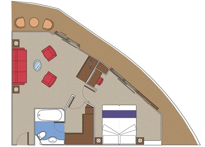 Suite s balkónom/panoramatickým oknom: 21-47m², kajuta s manželskou posteľou (na požiadanie 2 oddelené postele) a rozkladacia pohovka. Klimatizácia, kúpeľňa s vaňou, toaletný stolík, priestranná skriňa, interaktívna TV, telefón, minibar, sejf, sušič na vlasy. Balkón so stolíkom a stoličkami/panoramatické okno. Internetové pripojenie (za poplatok).