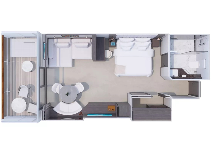 | Retreat Residence Suita 63 m² + Terasa s vírivkou a sedením 14 m² / 7. paluba: 18 m². Spálňa s obývacou a jedálenskou časťou, šatník. Koktailová súprava, minibar, kávovar, vodná kanvica, ďalekohľad, sejf, mramorová kúpeľňa s vaňou a sprchou, extra wc. Taška Technogym Case Kit. Fľaša šampanského na privítanie. Služby osobného majordóma. Maximálna kapacita 3 dospelí alebo 2 dospelí + 2 deti pod 18 rokov. | 37 272 € 9 318 € za osobu | ||