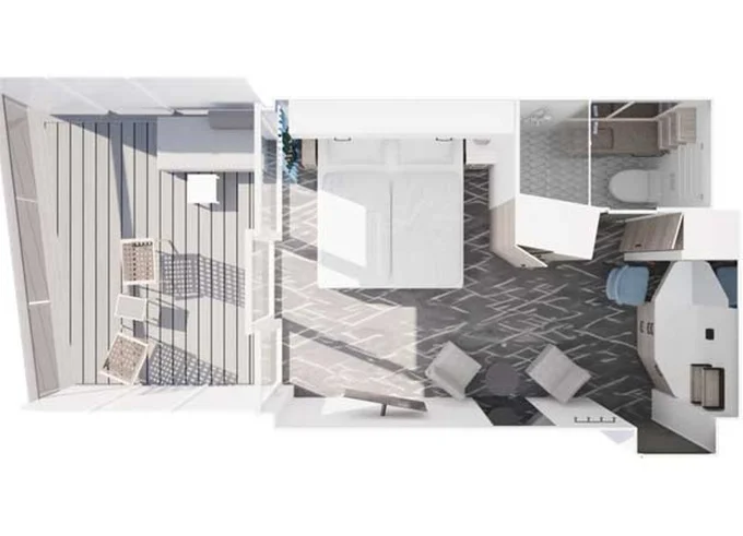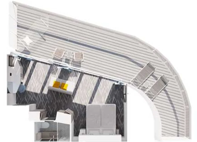 | VKKO - Kajuta s terasou 20 m² + balkón 13 m² so stoličkami a váľandou. 15. paluba. Max 2 osoby. | 5 438 € 2 719 € za osobu | ||